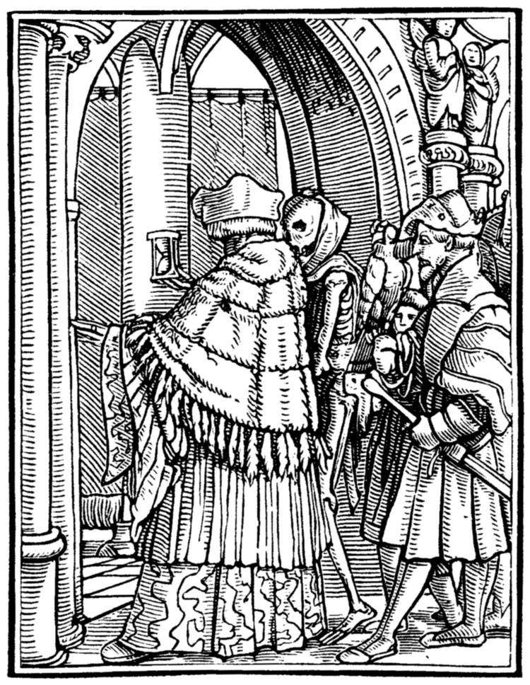 The Canon, with his falconer, page, and jester, enters the church door. Death shows him that his sands have run.