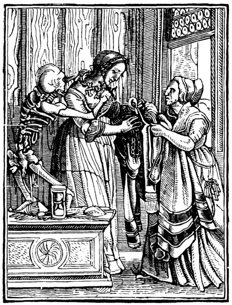 Death helps her at her tiring by decorating her with a necklet of dead men's bones.