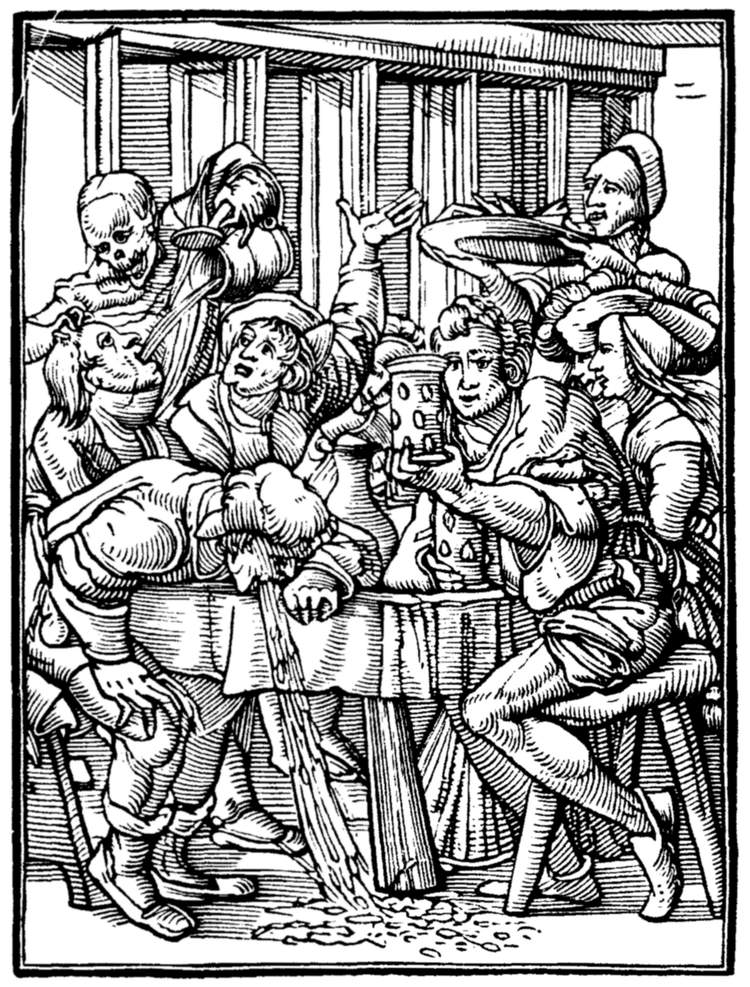 Men and women carouse: down the throat of one bloated fellow Death pours the wine.