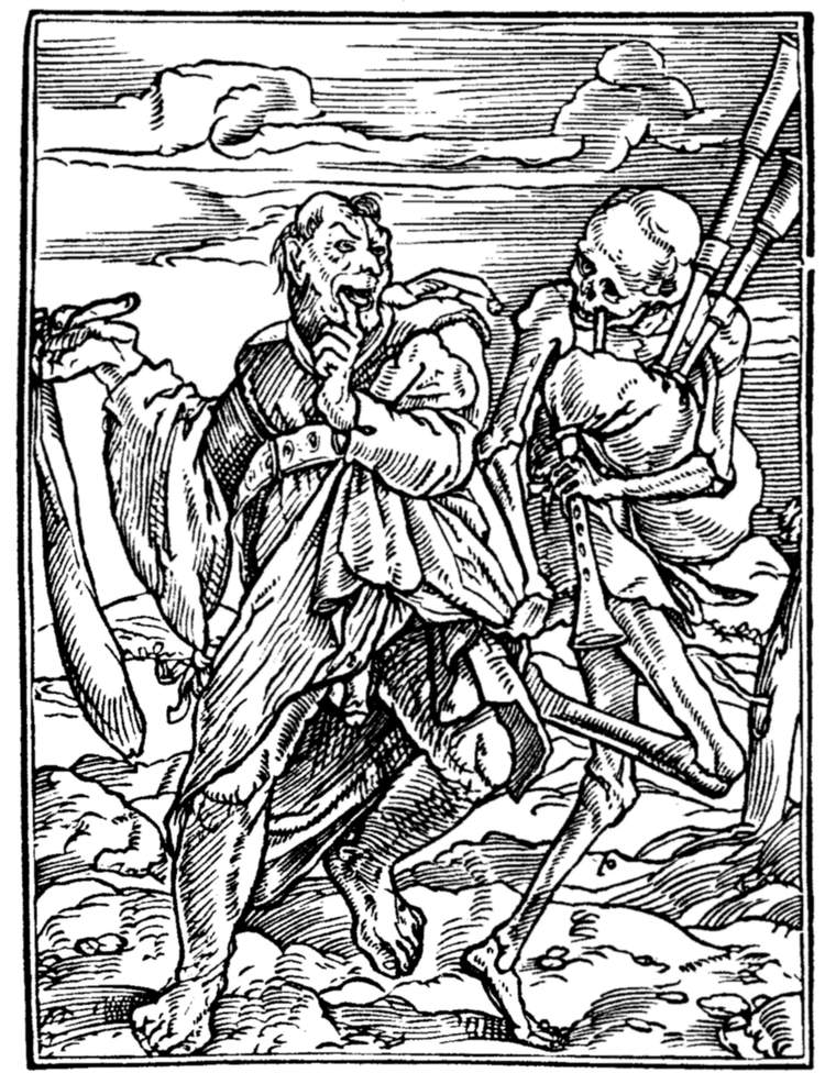 The Fool dances along the highway with Death, who plays the bagpipes.