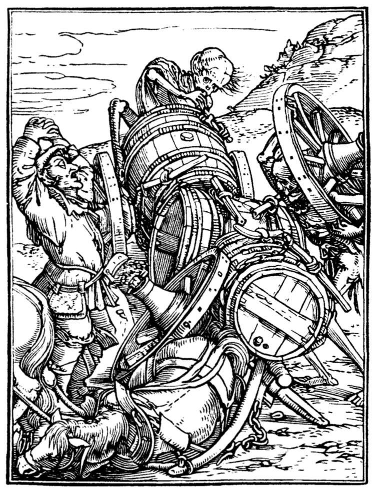 The wagon is overturned; one Death carries off a wheel, the other loosens the fastening of a cask.