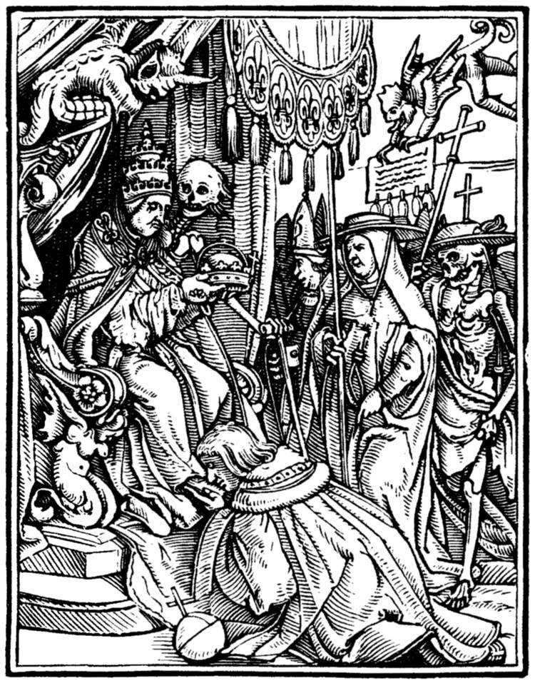 The Pope (Leo X.) with Death at his side, crowns an Emperor, who kisses his foot. Another Death, in a cardinal's hat, is among the assistants.