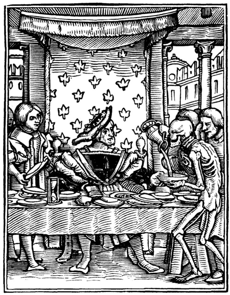 The King (Francis I.) sits at feast under a baldachin sprinkled with fleurs-de-lis. Death, as a cup-bearer, pours his last draught.